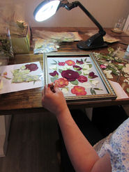 Lunch is provided, and after the break, we focus on mounting flowers onto paper backings and cutting them out. This step ensures greater stability for the flowers, making designing easier. This process takes several hours, followed by hands-on designing. By the end of the first day, most students will have completed one or two framed designs.